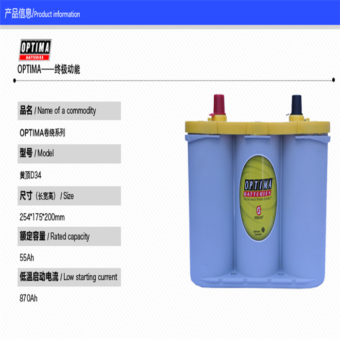 奥铁马蓄电池OPTIMA黄顶34,55AH CCA870...