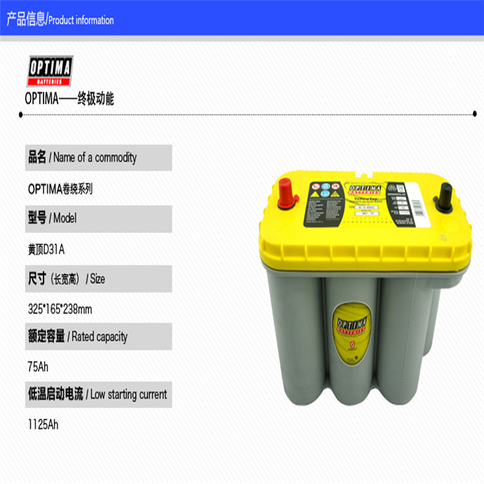 根据OPTIMA官方提供的测试数据,OPTIMA蓄电池的使用寿命是普通电池的两到三倍.由于OPTIMA的独特结构,决定了其内阻极低,因此OPTIMA系列蓄电池自放电很小,充电很快,具有超强的充放电深环能力.由于采用了抗冻电解液与"海绵吸附结构",OPTIMA蓄电池无论是在赤道还是在北极,都有优异的可靠性表现.在爱斯基摩人屯居的北美阿斯加,OPTIMA即使被搁置了一个漫长的冬季仍能保持绝大部分电力,足以启动拖机、挖掘机以及游艇这类的大型车船.